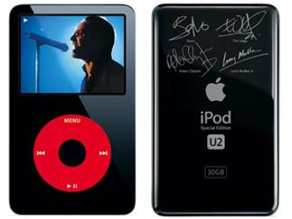 Para celebrar la asociación promocional de la compañía con la legendaria banda de rock, Apple presentó el iPod U2 Special Edition como parte de una asociación entre Apple, U2 y Universal Music Group (UMG) para crear juntos nuevos productos innovadores para la nueva era de la música digital a $349 en 26 de octubre de 2004. El nuevo iPod de U2 tiene capacidad para 5,000 canciones y presenta una hermosa carcasa negra con una rueda de clic roja y un grabado personalizado de las firmas de los miembros de la banda U2. Además, el iPod U2 Special Edition incluye un cupón de iTunes Music Store que los usuarios pueden canjear por $50 de descuento en "The Complete U2". Es muy valioso para la colección. El momento del lanzamiento, no solo antes de la temporada navideña, sino también para coincidir más o menos con el lanzamiento del último álbum de U2, How to Dismantle an Atom Bomb, puede significar que más de un fanático de U2 finalmente encontró lo que están buscando.