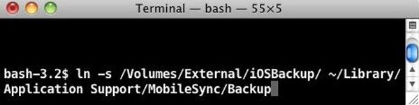 Paso 2 Inicie Terminal (ubicado en Aplicaciones/Utilidades/Terminal) y abra un símbolo del sistema. Cree un enlace simbólico usando un comando similar al siguiente, "ln -s /Volumes/External/Backup/ ~/Library/Application Support/MobileSync/Backup".