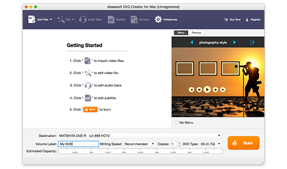 Hacer sus propias películas en DVD en Mac OS Big Sur será fácil y divertido con la ayuda de DVD Creator para Mac. Puede crear sin esfuerzo un DVD a partir de cualquier archivo de video, como AVI, VOB, WMV, MP4 e incluso video Flash (FLV). Además, puede convertir videos populares a carpetas de DVD o archivos ISO.