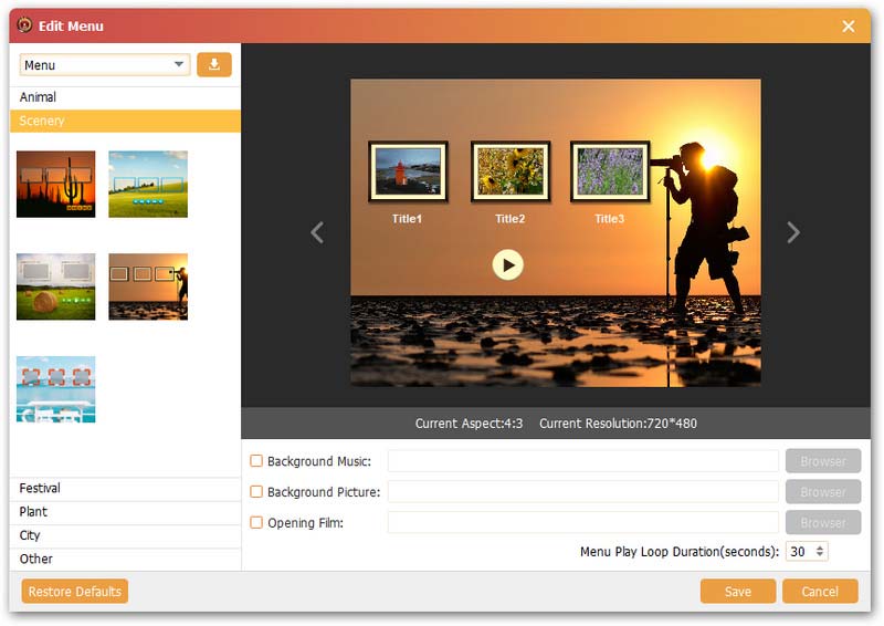 Cuando crea DVD, se le proporcionan múltiples opciones para editar el menú, como la plantilla de menú, el marco, el botón y el texto que desee.