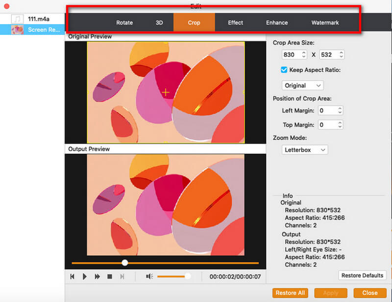 Este Mac HD Converter viene con múltiples funciones de edición que le permiten personalizar los efectos de audio y video de salida. Puede ajustar los videos HD/SD con diseños específicos para diferentes aspectos. Con la ayuda de varias herramientas, puede rotar y recortar su archivo y mejorar el resultado final libremente. Hay muchos efectos y filtros para embellecer sus videos y las marcas de agua son compatibles con sus derechos de propiedad para agregar a su producto. E incluso puede traer fácilmente efectos 3D al video de salida para obtener resultados vívidos.