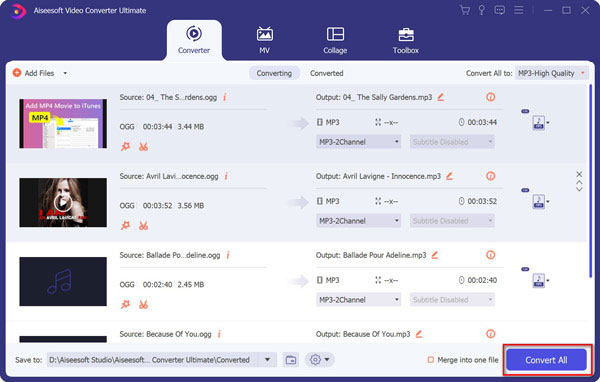 Haga clic Convertir botón para iniciar la conversión de OGG a MP3 y se terminará en poco tiempo. Después de la conversión, el archivo MP3 convertido se guardará automáticamente en su computadora.