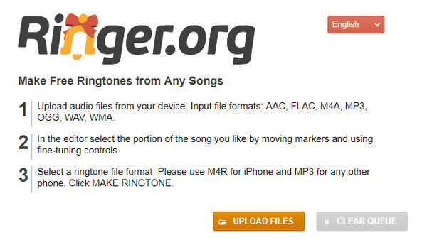 Además de las formas anteriores, también puede crear tonos de llamada gratuitos para iPhone en línea. Hay muchos creadores de tonos de llamada de iPhone en línea que pueden ayudarlo a crear tonos de llamada de iPhone en línea. Presentaremos principalmente uno de estos sitios web para usted. Le presentaremos los pasos en Ringer.