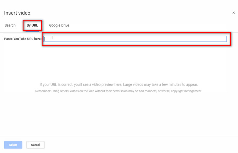 1. If you have the full URL of the YouTube video you want to insert, you can choose the Por URL tab. Then, type or paste it into the search box and press Participar.
