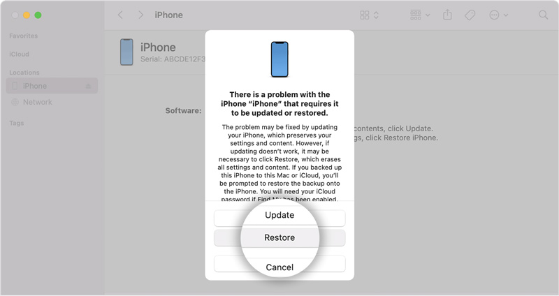 Tenga en cuenta que esta solución borrará todos los datos de su iPhone y lo restaurará a su configuración de fábrica. Para que pueda ingresar a su iPhone deshabilitado sin un código de acceso de pantalla de bloqueo. Si no se puede reconocer su iPhone o iPad deshabilitado, debe apagar su dispositivo iOS y ponerlo en modo de recuperación. Luego conecte su dispositivo a una Mac o PC con Windows, ejecute iTunes y haga clic en el botón Restaurar .
