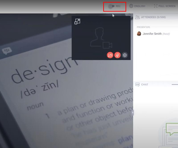 Primero, active el REC en la parte superior de la ventana de la sala del seminario web. Una luz roja intermitente indica que la reunión se está grabando.