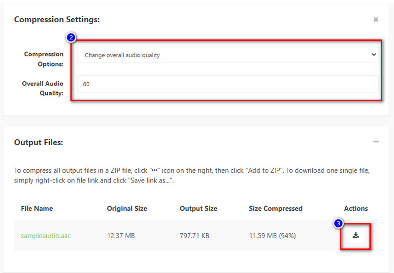 ¿Quieres comprimir archivos de audio AAC en línea? Si es así, puede intentar utilizar el Ocomprimir, que está disponible en la web de forma gratuita. Esta herramienta web puede comprimir el archivo sin descargar o ingresar código para comprimir el archivo. Además, no debería preocuparse por la compatibilidad de este compresor web porque está disponible en todos los navegadores. Aunque la herramienta web es de uso gratuito y accesible, algunos inconvenientes podrían generar una mala experiencia, como el tiempo de carga. Teniendo en cuenta que está basado en la web, cargar, procesar y descargar el archivo AAC aquí consume más tiempo que las dos primeras herramientas. Pero si no le importa esperar esos procesos, debe intentar usar este compresor siguiendo los pasos a continuación.
