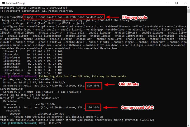 Para comprimir archivos de audio AAC usando códigos, puede intentar usar FFmpeg. Este software no es el compresor habitual que puede descargar en su escritorio y luego usar de inmediato, ya que utiliza un símbolo del sistema para poder funcionar. A diferencia de Aiseesoft Video Converter Ultimate, esta herramienta funciona si agrega el código adecuado al comprimir. Aunque parece un desafío usar este software, todavía se considera uno de los compresores precisos que debe tener en su escritorio para comprimir el archivo AAC que tiene. Además, este software puede funcionar en otras cosas como convertir, recortar y demás. Para ayudarlo a usar esto, puede copiar los pasos a continuación y comprimir el AAC usando este software.
