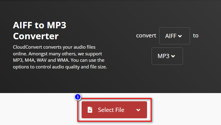 CloudConvert es una opción que puede elegir para hacer una compresión AIFF en línea de forma gratuita. Esta herramienta puede cambiar el códec de audio, la tasa de bits, los canales y demás para hacer que el archivo AIFF que cargue aquí sea más pequeño que antes. También puede usar las otras funciones que proporciona, que es la recortadora. Aunque puede usar la herramienta de forma gratuita, después de exportar el formato, la extensión del archivo será .mp3 y ya no será .aiff. Si esto no le molesta, puede seguir los pasos a continuación.