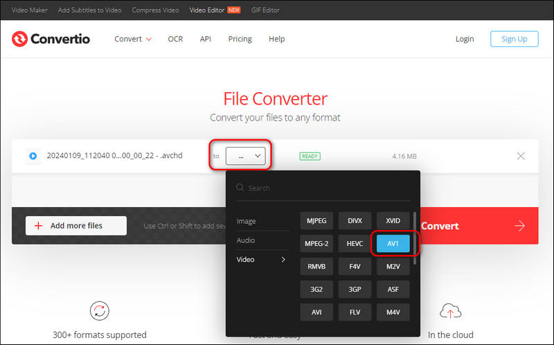 Cuando quieras convertir AVCHD a AVI en línea, puede buscar Convertio en su navegador web e ir a su página de conversión de AVCHD a AVI. Este conversor en línea admite más de 300 formatos multimedia, incluidos MP4, AVI, WMV, OGV, etc. Es seguro de usar y no necesita preocuparse por la pérdida de información. Estos son los pasos para convertir AVCHD a AVI con Convertio.