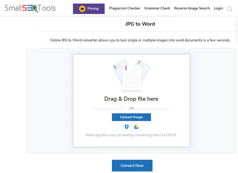 Pequeña herramienta SEO tiene una interfaz web fácil de usar que permite a los usuarios convertir JPG a Word en Mac y Windows, ya que tienen un navegador. Esta aplicación utiliza la conversión en la nube, lo que significa que puede realizar la conversión más rápido incluso si tiene un procesador bajo. Además, puede convertir imágenes a PDF con la aplicación. Sin embargo, cuando visita la página web oficial del convertidor, aparecen muchos anuncios, lo que hace que la experiencia de conversión sea un poco menor. Bien. Si se pregunta cómo funciona esta herramienta en línea, siga los pasos a continuación.