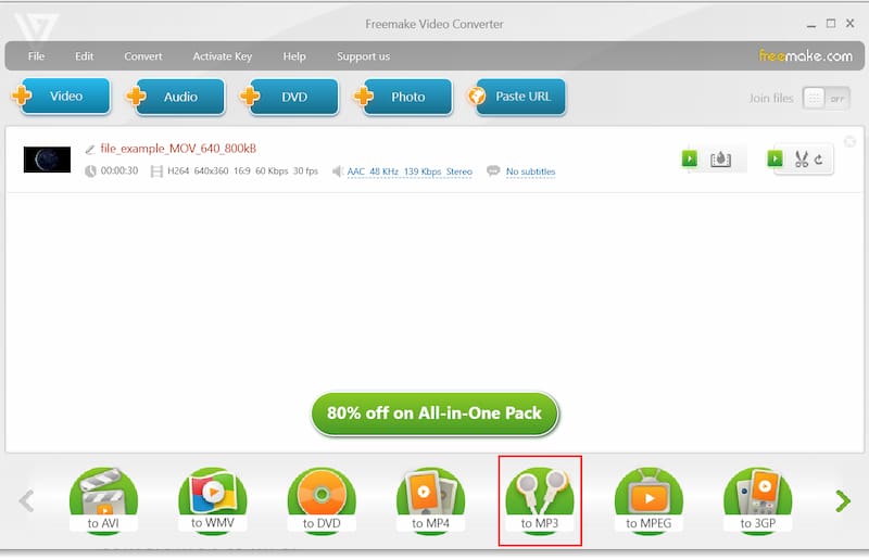 Freemake Video Converter es una herramienta gratuita para convertir vídeos MOV en MP3 sin costes ni restricciones ocultos. Es una gran opción en comparación con las alternativas pagas. Con este software, puedes importar y convertir fácilmente vídeos y audio a diferentes formatos. También ofrece funciones sencillas de edición de vídeo, como recortar y agregar subtítulos. En general, proporciona una experiencia de usuario excelente y única. A continuación se detallan los pasos que puede seguir.