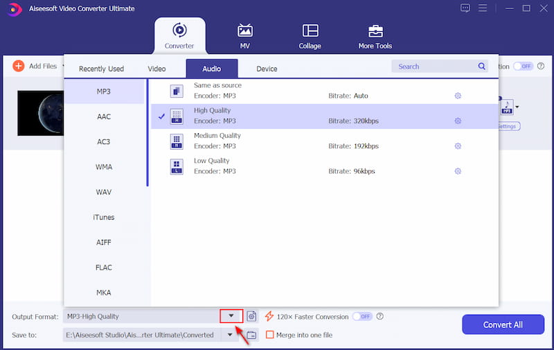 En el menú desplegable Convertir a, seleccione Audio y elija MP3 como formato de salida.