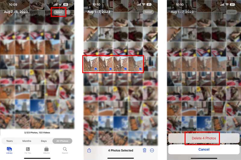Abre la aplicación Fotos y toca el Todas las fotos pestaña en la parte inferior para ver toda su biblioteca de fotos. Grifo Seleccione y luego elija manualmente todas las imágenes de su iPhone. Después de eso, toca el Borrar botón para eliminarlos.