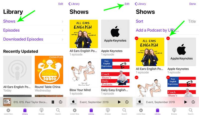 1. corrida Pódcasts app en tu iPhone > Navega por el "de Recursos"pestaña > Pulsar"Shows" > Haga clic en "Editar" opción en la esquina superior derecha > Busque el programa de podcast individual suscrito y toque el ícono menos en la esquina superior izquierda de la portada del podcast para eliminarlo.