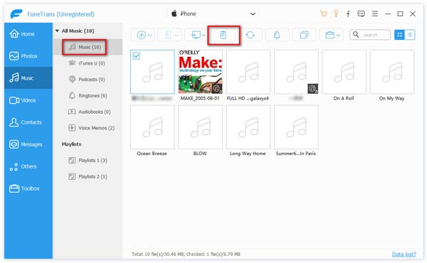 Resalte y marque la casilla de verificación de las canciones de destino del iPhone que desea eliminar. O puede elegir todas las canciones y eliminarlas de forma masiva del iPhone de una vez por todas. Luego haga clic en el botón de "eliminar" para eliminar canciones del iPhone.