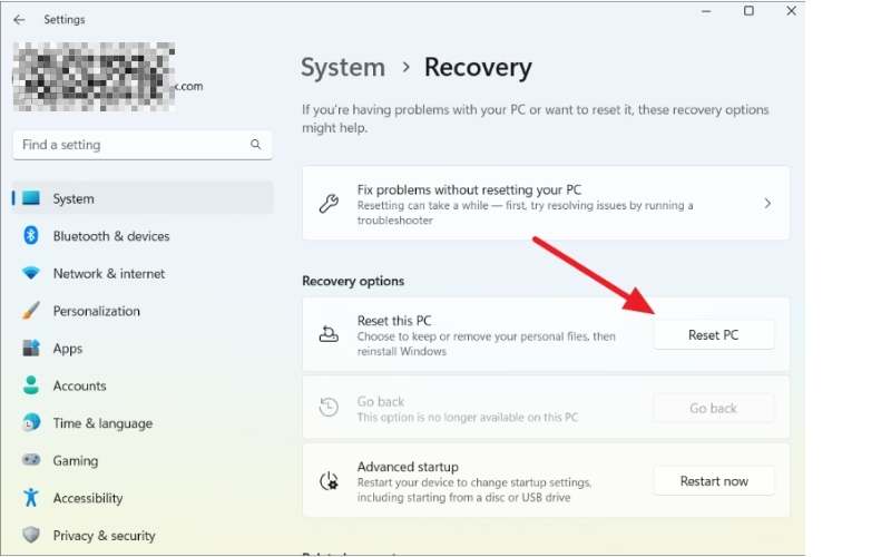 • Go to Settings, select the System, click Recovery, then choose Reset this PC.