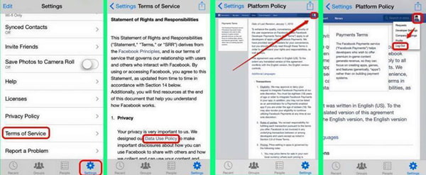 Paso 2Toca "Términos de servicio". Desplácese hacia abajo y podrá encontrar y luego tocar las palabras dentro del hipervínculo azul, "Política de uso de datos".