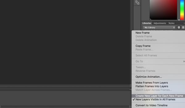 Primero debe seleccionar todas las capas eligiendo "Seleccionar" > "Todas las capas". Después de eso, puede hacer clic en el ícono del menú para elegir tanto "Crear una nueva capa para cada nuevo marco" como "Crear marcos a partir de capas" para hacer que cada capa sea un marco de un archivo GIF.
