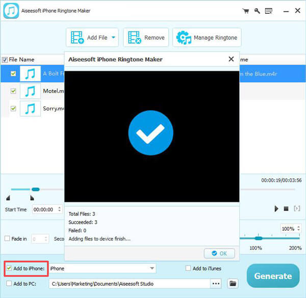 Este potente creador de tonos de llamada para iPhone te permite dividir la canción en partes para guardar solo las partes que te gustan. Después de editar archivos de audio, puede transferir directamente estos tonos de llamada al iPhone. Asegúrese de seleccionar todos los tonos de llamada y marque "Agregar a iPhone", luego haga clic en "Generar" para importar tonos de llamada a iPhone. Además, puede usarlo para eliminar los tonos de llamada innecesarios del iPhone.