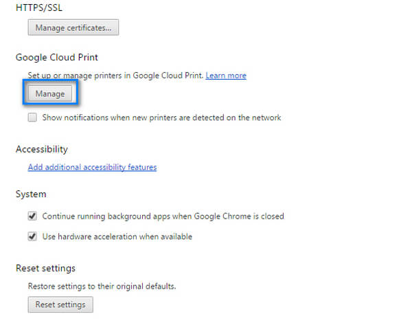 Paso 3Desplácese hacia abajo hasta la sección Google Cloud Print y haga clic en Gestionar.