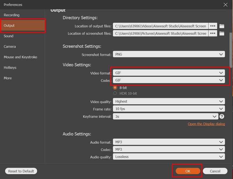 Opcional: Después de hacer clic en él, aparecerá una nueva barra de herramientas; haga clic en el diente , cambie el formato de salida a GIF para guardar el archivo grabado como GIFy presione OK Para guardar los cambios.