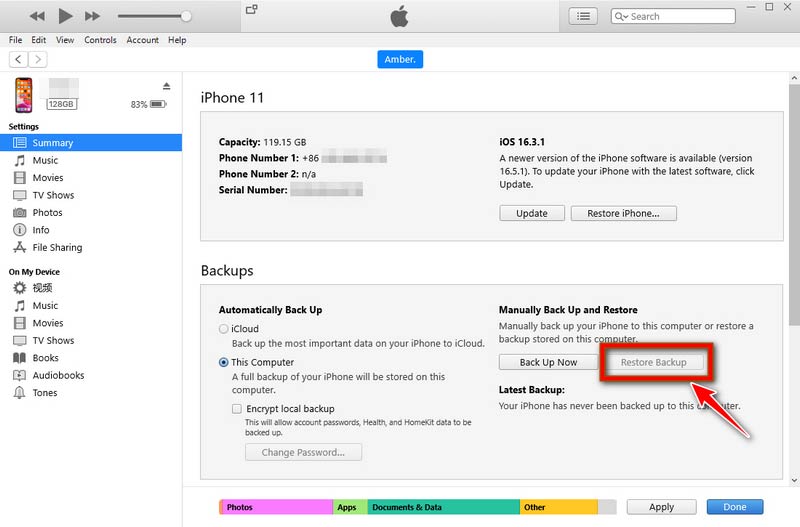 iTunes puede ayudarlo a restaurar todo desde su última copia de seguridad, incluidos los mensajes. Pero si eliminas los mensajes recién recibidos después de una copia de seguridad, iTunes no puede ayudarte a recuperarlos. Además, restaurar el contenido de la copia de seguridad de iTunes sobrescribirá los datos locales de su iPhone. Por lo tanto, será mejor que haga una copia de seguridad de la información importante del iPhone para evitar la pérdida de datos.