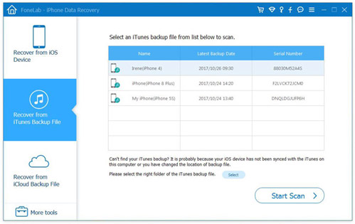 Puede ver que todos los archivos de copia de seguridad de iTunes se enumeran en la interfaz. Seleccione la copia de seguridad de iTunes adecuada y haga clic en "Iniciar escaneo" para escanear videos eliminados en esta copia de seguridad de iTunes.