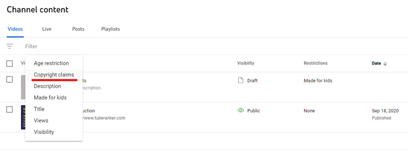 Puedes apelar la decisión si tu video de YouTube fue eliminado debido a una infracción de políticas o una advertencia por derechos de autor. Haz clic en Contenido para acceder al contenido del canal y encontrar el video eliminado. También puedes usar el filtro integrado para localizar rápidamente los videos seleccionados seleccionando "Reclamaciones por derechos de autor".