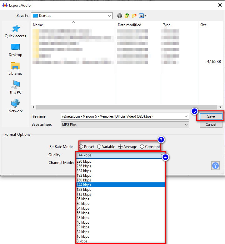 Para reducir el tamaño de MP3 en Audacity, puede intentar cambiar la tasa de bits del audio. Bitrate es quien determina los datos asignados en cada archivo MP3 o cualquier archivo de audio que tenga. La mayoría de los archivos de audio tienen una tasa de bits más alta, lo que indica que su calidad también es más alta. Aquí, puede cambiar la tasa de bits de su archivo de audio desde 320 kbps hasta 8 kbps. Entonces, si desea cambiar la tasa de bits en Audacity para reducir el tamaño, siga el paso a continuación.