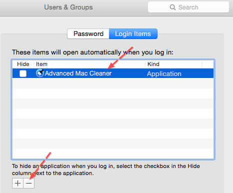 Paso 3Busque la entrada Advanced Mac Cleaner, selecciónela y haga clic en el botón "-" para eliminar el programa.
