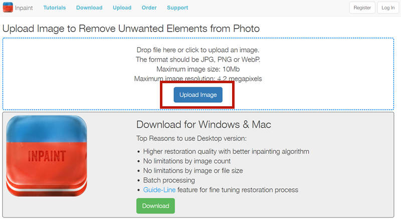 Inpaint también es una herramienta en línea que puede usar para eliminar los sellos de fecha en las fotos. Sin embargo, solo le permite recuperar la imagen resultante en baja resolución a menos que pague los créditos de descarga. Aparte de la política de cobro, otras cosas sobre esta herramienta son bastante buenas. Veamos cómo usarlo.
