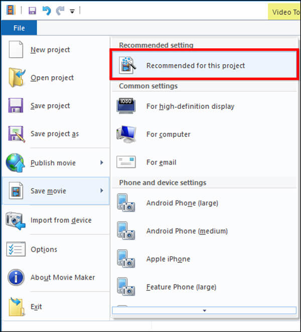 Paso 4 Vea el video en Windows Movie Maker para asegurarse de haber logrado el efecto deseado. Si está satisfecho con el resultado, haga clic en el menú "Archivo", despliegue el menú "Guardar película" y elija un dispositivo de destino. WMM transcodificará y guardará el video rotado para reproducirlo en una computadora, iPhone, teléfono Android, YouTube o Facebook automáticamente y en diferentes calidades de video.
