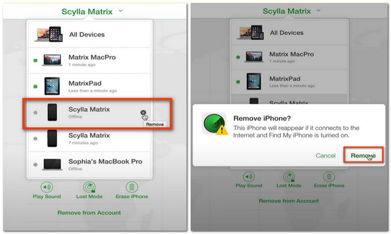 O también puede hacer clic en el modelo de iPhone y elegir Eliminar de la cuenta para cerrar sesión.