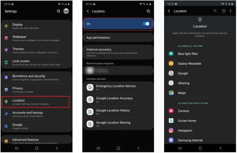 Como usuario de Android, también debe ir a la Ajustes aplicación y encuentra el Ubicación opción para ajustar el uso compartido de la ubicación. En algunos dispositivos Android, debe tocar el botón Conexiones or Privacidad pestaña para acceder a la opción Ubicación. Al igual que desactivar los servicios de ubicación en un dispositivo iOS, puede optar por cerrar todos los servicios de ubicación o simplemente evitar que algunas aplicaciones utilicen sus ubicaciones.
