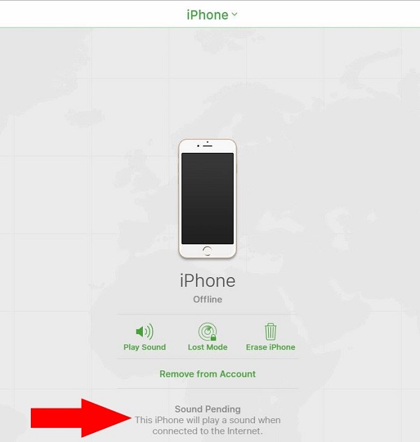 Paso 4 Luego, su iPhone aparecerá como un punto verde en el mapa. Presiona el punto verde y luego aparecerá un cuadro de diálogo con tres opciones, Reproducir sonido, Modo perdidoy Borrar iPhone.