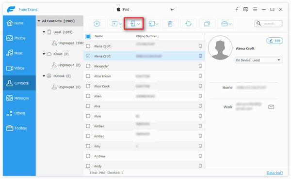 Aiseesoft FoneTrans es el mejor software de transferencia de contactos de iOS para sincronizar y administrar contactos, mensajes, videos, notas, calendarios entre dispositivos iOS, computadora e iTunes. Con este potente software de transferencia de datos de iOS, puede transferir todos los contactos del iPod al iPhone, a la computadora o iTunes.