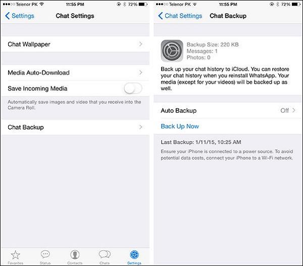 Paso 1Obtenga la aplicación WhatsApp instalada en su dispositivo iPhone y Android. Encienda el dispositivo fuente, abra WhatsApp, vaya a Ajustes, grifo Chats Backup y luego golpear Copia ahora para hacer una copia de seguridad de los mensajes.