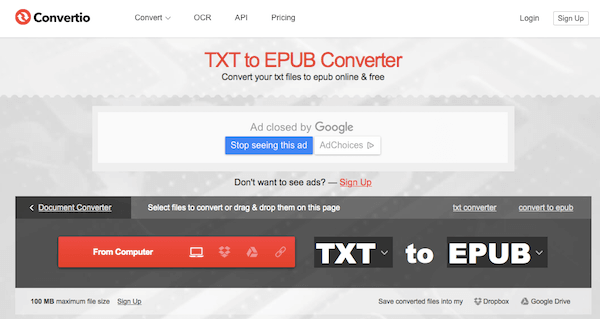 Convertio también es un buen convertidor de TXT a ePub en línea que puede elegir para convertir TXT a ePub. Pero hay algunos anuncios en este convertidor en línea. Tal vez puedas registrarte para eliminarlos. Debe saber que el tamaño máximo de archivo que puede cargar es de 100 MB.