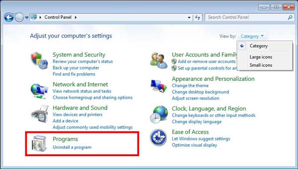 Como usuario de Windows 8 o Windows 7, debe ir al Panel de control para desinstalar el navegador web Firefox. Después de ingresar al Panel de Control, localiza el Programas opción, y luego haga clic Desinstalar un programa debajo de ella.