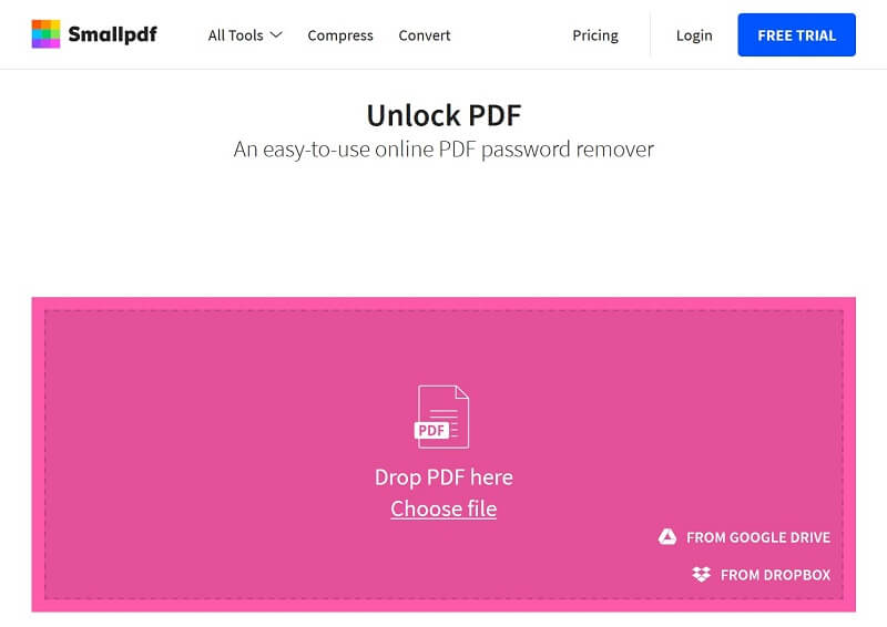 SmallPDF es una solución todo en uno para documentos PDF. Le permite procesar dos archivos PDF por hora de forma gratuita, incluido el desbloqueo de PDF.