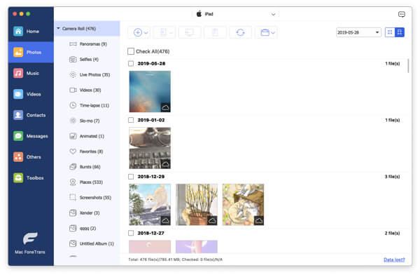 Haz clic en Fotos en el lado izquierdo. Obtendrá todas las fotos de su iPad en la interfaz principal de este software. A continuación, puede elegir las fotos que desea transferir del iPad a la Mac.