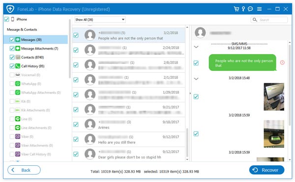 Elige Mensajes opción en la lista de la izquierda, aquí encontrará todos los iMessages, mensajes de texto y MMS eliminados de cualquiera de sus contactos. Luego, solo necesita ver y seleccionar los iMessages eliminados que desea recuperar.