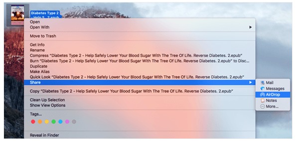Busque su libro ePub y haga clic derecho en su icono. Puede seleccionar "Compartir" y luego elegir "AirDrop" para transferir ePub a iPhone en Mac usando AirDrop.