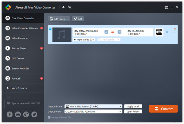Free Video Converter es el convertidor de audio y video gratuito, que puede ayudarlo a convertir AAC (.m4p) a otros formatos de audio, como MP3, WMV, FLAC, etc. para que pueda reproducir archivos AAC fácilmente.