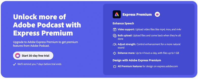Adobe Video Enhancer puede transformar sus grabaciones de baja calidad en audio claro y con sonido profesional. Como usuario ocasional y gratuito de Adobe, puede utilizar esta herramienta de mejora de voz para mejorar el audio de 1 hora al día. El tamaño máximo de archivo de una grabación de audio está limitado a 500 MB y la duración máxima es de 30 minutos. Puede superar estos límites y obtener funciones completas de Adobe Podcast actualizando a Express Premium. Adobe ofrece una prueba gratuita de 30 días antes de comprarlo.