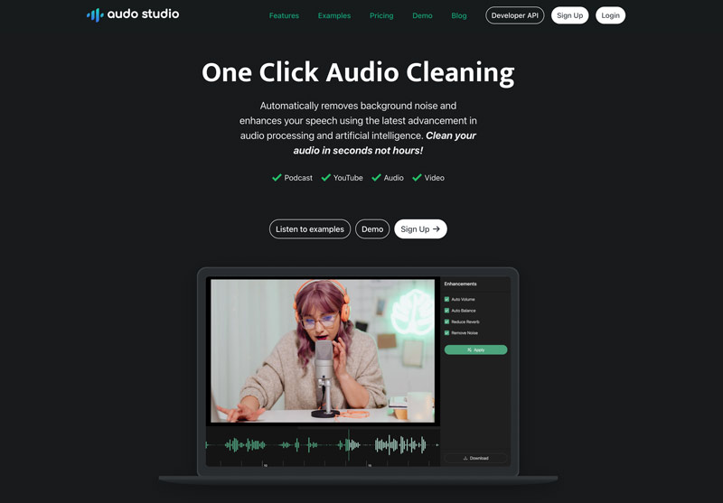 Audo Studio es una plataforma de inteligencia artificial basada en web que se utiliza principalmente para la limpieza de audio. Utiliza las últimas tecnologías de procesamiento de audio y aprendizaje automático para limpiar su audio y mejorar su calidad. Este reparador de audio impulsado por IA puede borrar eficazmente varios ruidos de fondo, como el tráfico, el viento, el zumbido y más. Además, puede ajustar automáticamente los niveles de volumen para garantizar el sonido más agradable. La nueva reducción de eco pronto se agregará a la herramienta de reparación de audio.