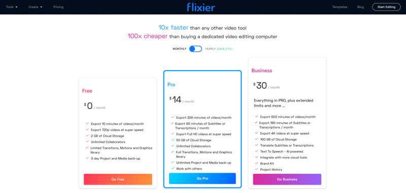 Flixier ofrece un plan gratuito con exportaciones limitadas y marcas de agua. Cuando desee exportar su audio mejorado y reparado con una marca de agua, se le pedirá que actualice. Como reparador de audio AI gratuito, Flixier proporciona funciones básicas para necesidades ocasionales de reparación y mejora de audio.