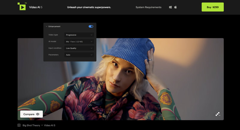 Topaz Video AI es un famoso potenciador de video que puede ayudarte a mejorar y restaurar la calidad del video. Al igual que Filmai, te permite mejorar fácilmente la resolución de videos antiguos, reducir el ruido, enfocar los bordes y optimizar el color y el brillo. Utiliza IA avanzada para generar resultados de restauración de alta calidad. Sin embargo, Topaz Video AI requiere una computadora potente para un rendimiento óptimo. Como herramienta de restauración de video con IA profesional, Video AI cuesta $299.
