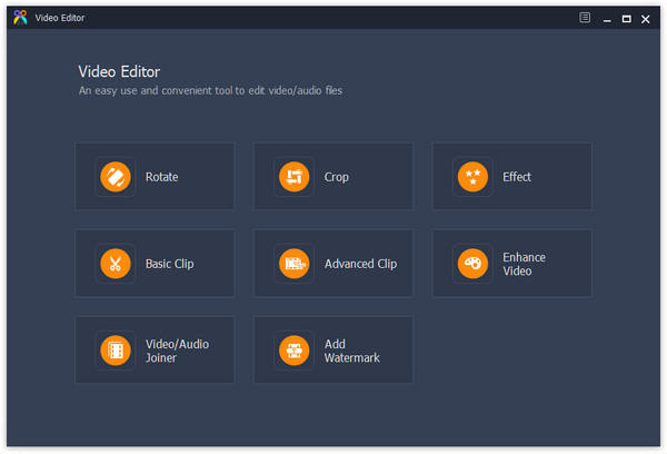 - 1. El Editor de video incorporado integra amplias herramientas de edición de video, como recortar, rotar, voltear, fusionar, marca de agua, efectos de video y más.
